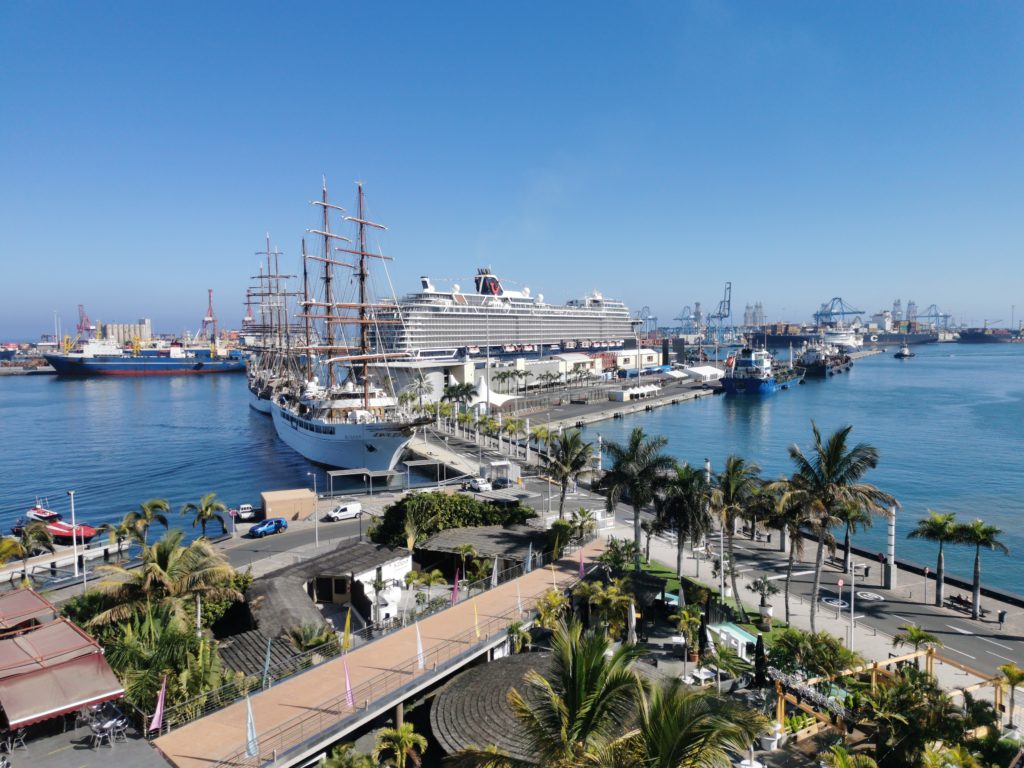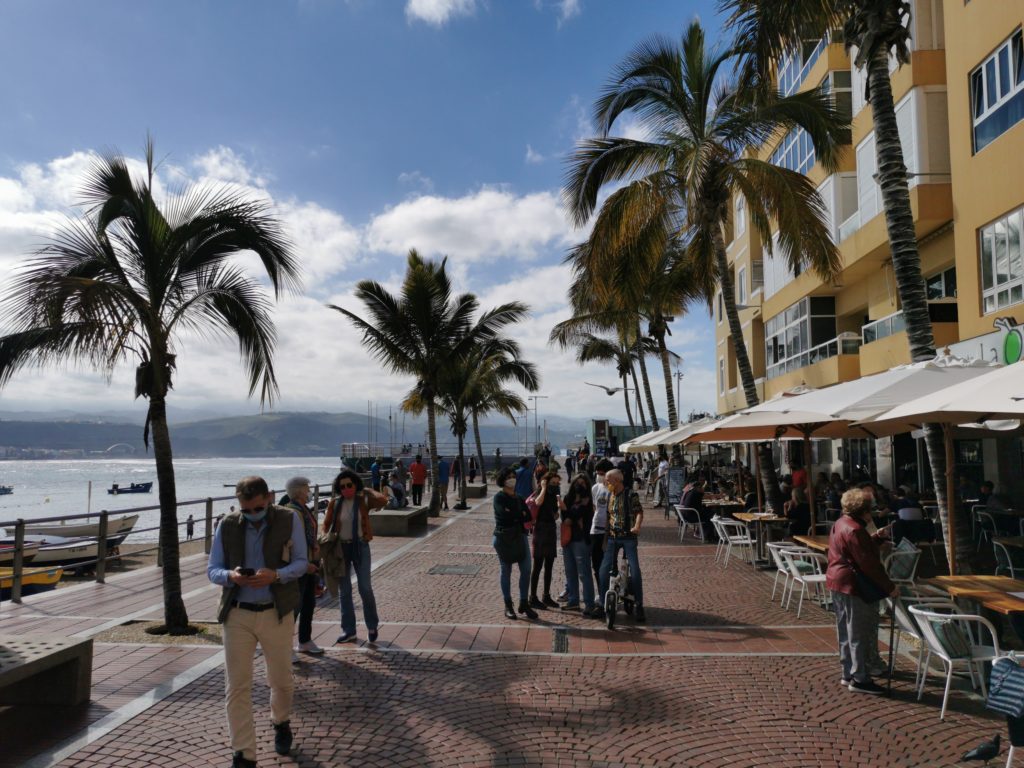 Wir beginnen den nächsten Tag mit einer ausgiebigen Erkundungstour und halten die Augen dabei nach Internet-Cafés und Bibliotheken offen. Den Surferstrand Playa de Las Canteras und die „lebhafte“ Strandpromenade wollen wir von nun an meiden – zu laut und touristisch. Wir passieren die zahlreichen kleinen Seitenstraßen und genießen das öffentliche Leben, auf das wir in den vergangenen Wochen in Deutschland weitestgehend verzichtet haben. Insbesondere die vielen kleinen Außen-Cafés (€1,20 für Cortado & Cappuccino) und Tapas-Läden vermitteln den Eindruck von Normalität. Wir verdrücken das ein oder andere bocadillo und beobachten das rege Treiben, das sich gänzlich von der „normalen“ Hauptreisezeit zu unterscheiden scheint. Auf der Suche nach einem geeigneten, mobilen Arbeitsplatz erreichen wir das Einkaufszentrum „El Muelle“ im Stadtteil La Isleta. Hier finden wir alles was wir brauchen: überdachte Außencafés, schnelles Internet und der Blick auf den Hafen Puerto De La Luz. Trotz touristischer Einschränkungen beschatten wir einige AIDA-Kreuzfahrt-Passagiere beim Einschiffen.