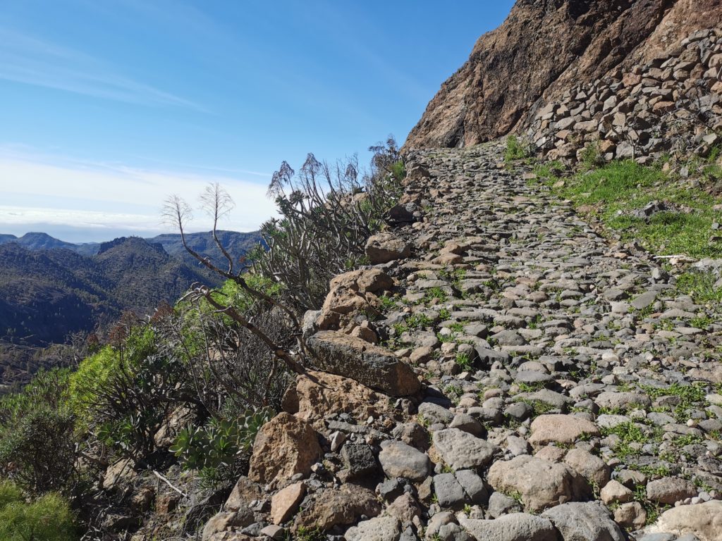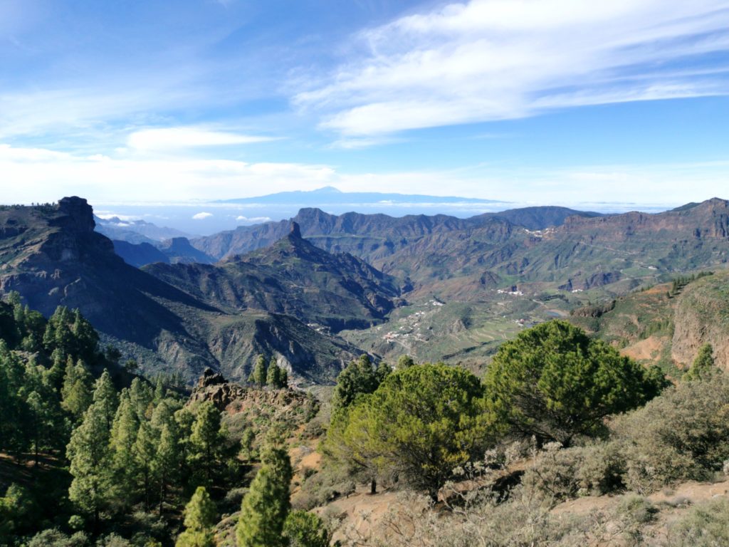 Jakobsweg „Camino de Santiago“ de Gran Canaria – einer der schönsten Naturwanderwege der Insel. Wir haben mittlerweile zwei Wochen auf Gran Canaria verbracht und uns an die Maskenpflicht, den Alltag und die klimatischen Bedingungen gewöhnt. Wir entschließen uns an diesem Wochenende für eine ausführliche Zwei-Tageswanderung über 48 Kilometer. Wir folgen der Empfehlung der Tourismusbehörde und entscheiden uns für eine Wanderung von Süden nach Norden. Der öffentliche Bus bringt uns hierfür zunächst in 1,5h von Las Palmas nach San Bartolomé de Tirajana – dem Ausgangspunkt unserer Route. Am nächsten Morgen starten wir früh und passieren zunächst die Kiefernwälder von Llanos de la Paz. Die gelb leuchtende Jakobsmuschel mit Pfeil, die uns die nächsten zwei Tage auf dem richtigen Pfad halten soll, verlieren wir direkt zu Beginn aus den Augen. Stattdessen verlassen wir uns auf die digitale Outdooractive-Karte, über die wir per GPS unseren aktuellen Standort überprüfen und gleichzeitig das Höhenprofil voraussehen können.