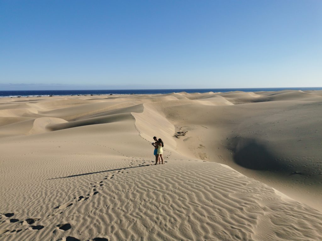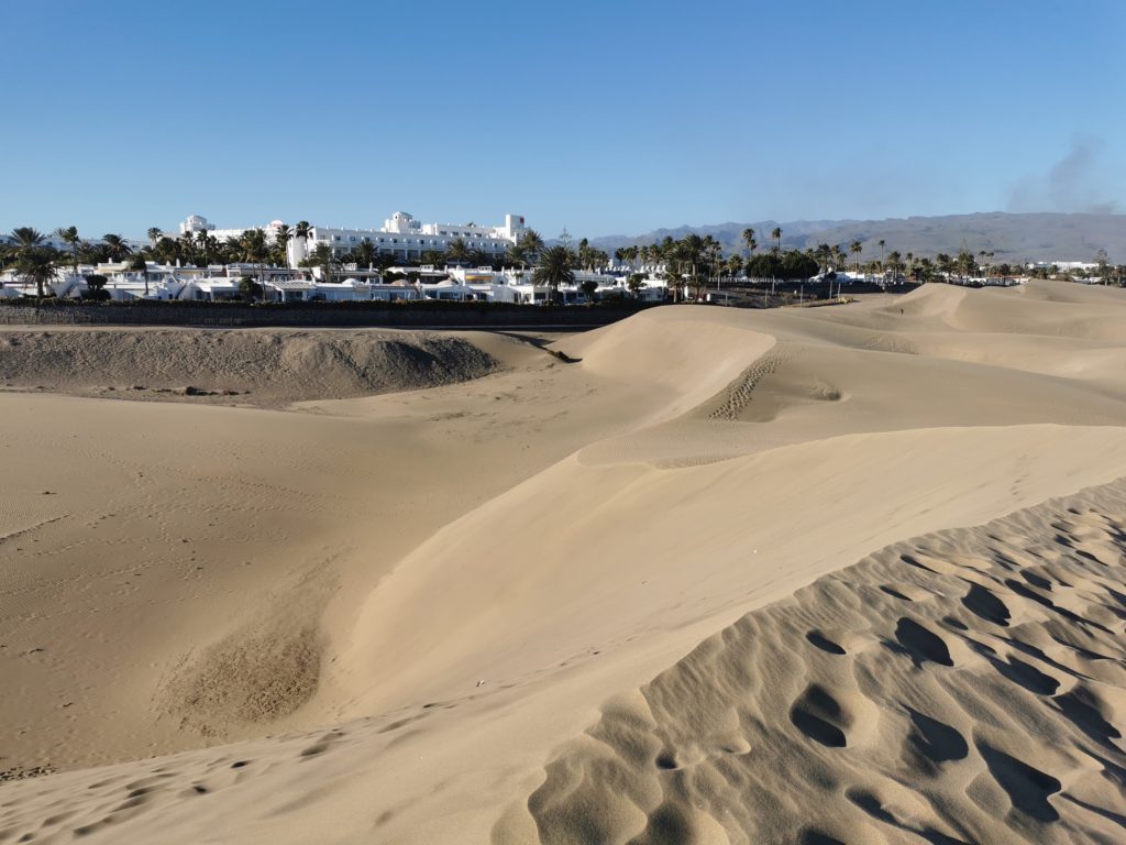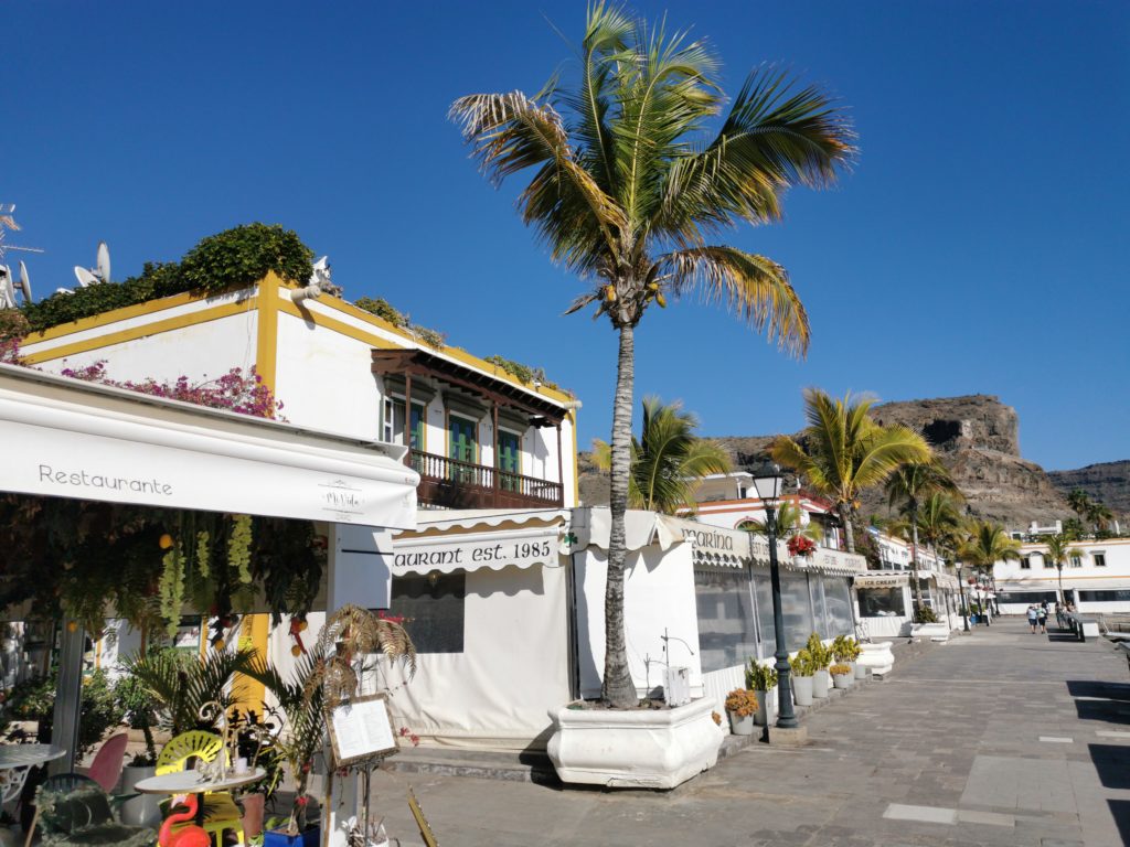 Nicht jeder mag Kaffee und Bewegung: Wer vermehrt auf der Suche nach Sonne, Strand und Meer ist und passiv urlauben möchte, dem seien die überwiegend mit deutschen und britischen Touristen besetzten Bars, Cafés und Restaurants im Süden Gran Canarias empfohlen. Während sich am Playa del Inglés ein Hotel-Betonklotz an den anderen reiht und das Nachtleben in Corona-fernen Zeiten in den Clubs und Discotheken stattfindet, verbreiten die Dünen von Maspalomas ein beruhigendes Sahara-Flair. Wir fragen uns nicht zu Unrecht wo die Dünen herkommen, denn mit Sahara-Sand haben die hohen Sandbänke nichts zu tun … 60% des Sandes wurde durch das Absinken des Meeresspiegels herangetragen, der Rest entstand durch die Zersetzung des Vulkangesteins aus dem Inselinneren. Wie gut besucht diese Orte zu normalen Hauptreisezeiten sind, möchten wir uns an diesem Tag lieber nicht vorstellen. Unweit vom Playa del Inglés befinden sich mit Puerto Rico und Playa de Mogán zwei weitere, sehr beliebte Ziele für Tagestouristen. Puerto de Mogán ist wegen seiner zahlreichen Wasserkanäle und Brücken auch als kleines Venedig bekannt. Aufgrund der idealen Bedingungen für alle möglichen Wasser-Aktivitäten ist der Strand auch an unserem Besuchstag sehr gut gefüllt. Wir meiden den Besucher-Trubel und besuchen lediglich die überdurchschnittlich bewertete Gelatomania.