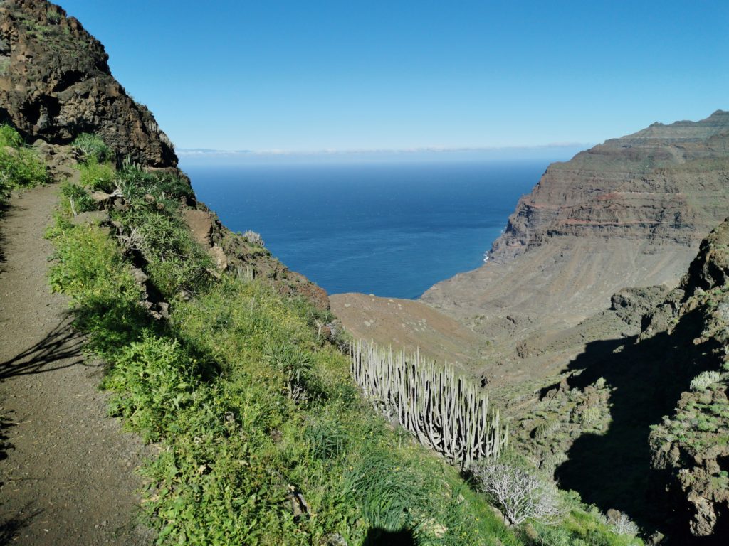 Wir legen in den nächsten Stunden knapp 1.000 Höhenmeter zurück und genießen den Blick auf das Wahrzeichen Gran Canarias – den Roque Nublo. Gemeinsam mit dem Pico de las Nieves (1.949m) bildet er den höchsten Punkt der Insel. Für die Übernachtung in der Finca la Isa in Cruz de Tejeda müssen wir zunächst unseren negativen Corona-Test vorlegen. Wir genießen die Naturdusche und den beeindruckenden Bergblick und bekämpfen den aufkommenden Sonnenstich mit eiskaltem Cerveza Tropical. Gut erholt, gesättigt und mit neuen Wasservorräten treten wir am nächsten Tag den mit 30 Kilometern längsten Abschnitt unserer Wanderung an. Wir genießen die klare Luft, den Blick auf die am Horizont liegende Nachbarinsel Teneriffa, passieren abgeschiedene Bergdörfer und führen im Sinne des Heiligen Santiago das ein oder andere tiefgründigere Pilger-Gespräch. Nach einem knapp vierstündigen, kontinuierlichen Abstieg nähern wir uns wieder der Zivilisation und erreichen unser Etappenziel – die Wallfahrtskirche Parroquia de Santiago Apóstol in Gáldar.