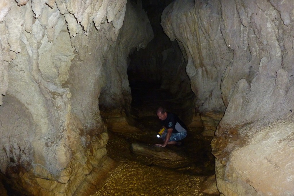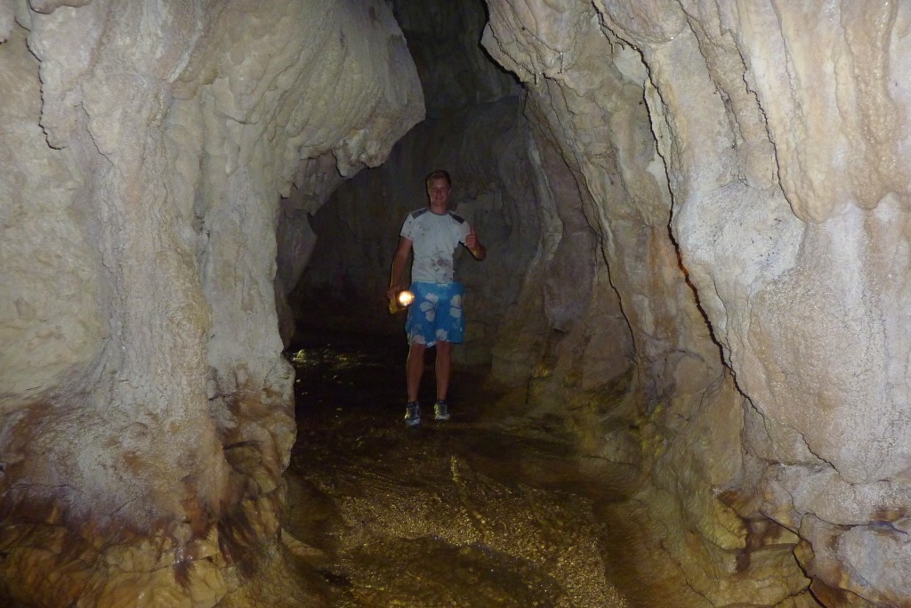 Ausweichprogramm am Montag: In 2 Stunden wanderten wir durch unterirdische Grotten (Caves) und Flüsse. Der Eingang zu dieser privaten Höhle war auf der Schafweide vom Nachbarn.