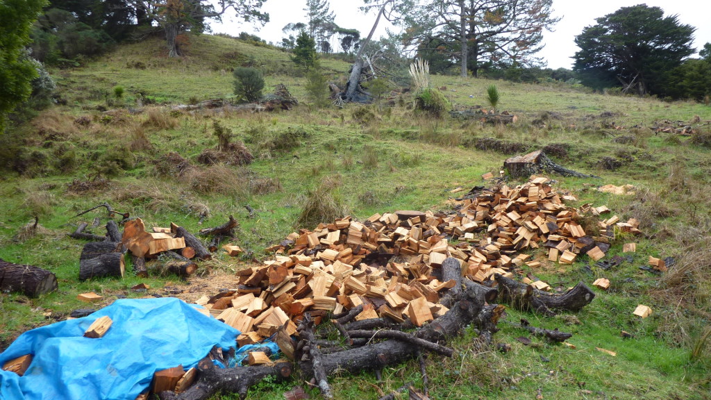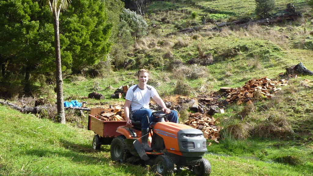 Danach sollte ich den Brennholzbestand für den nächsten Winter sichern. Ein, bei diesem 20 Hektar großen Gelände, eher geringes Problem. Das Holz habe ich Kamin-gerecht gespalten und anschließend mit dem lawn-mower (rechts im Bild, richtig cooles Gerät!!) zum Holzlager gefahren: