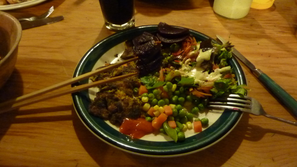 - Salat und rote Beete aus dem Garten, selbstgemachtes Dressing und selbstgebackenes Brot mit Eiern – und baked beans (aus der Dose)