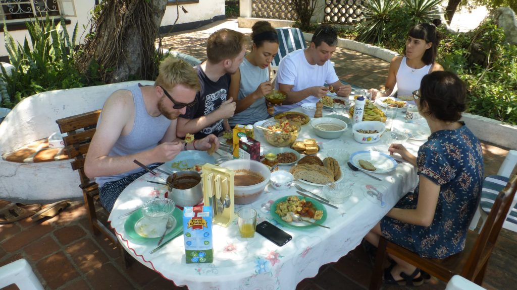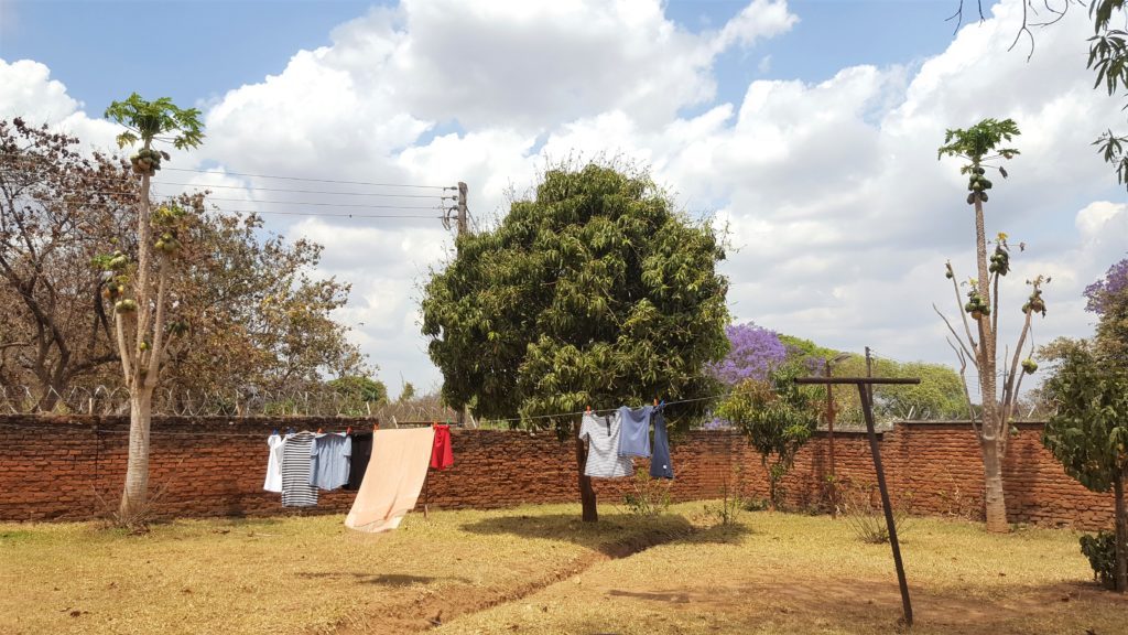 Wer keine Probleme damit hat, dass die Fußleiste nicht passgenau auf die andere Fußleiste anschließt, das Duschwasser erst einige Minuten vorheizen muss bevor es warm wird (bei Temperaturen über 35 Grad darf das Wasser auch gerne mal kühler sein), dass von vier Herdplatten nur die Hälfte (oder weniger) funktioniert oder damit, dass Gecko und co. sich auf dem Weg nach draußen gerne mal in Küche oder Wohnzimmer verirren, der wird in Malawi mit einigen weiteren Überraschungen gut und gerne für einige Zeit leben. Für zusätzlichen Schutz in einem für afrikanische Verhältnisse sehr sicheren Reiseland sorgen drei Sicherheits-Guards, die rund um die Uhr die einzige Einfahrt zum Compound bewachen. Für die Sicherheit von Obst, Gemüse und Pflanzen, die im Zuge der heißen Temperaturen der kommenden Sommermonate auf der Liste der gefährdeten Arten ganz weit nach oben rücken, ist ein Gärtner verantwortlich. Haushalt, waschen und putzen übernehmen in Malawi traditionell die Angestellten, sofern man sich diese leisten kann. Da unsere Nachbarschaft in der Regel das gleiche Schicksal teilt wie wir – auf bestimmte Zeit an einem unbekannten Fleck in einem fremden Land – finden wir uns mehrmals wöchentlich zusammen und kochen, trinken, machen Musik oder schauen Filme.