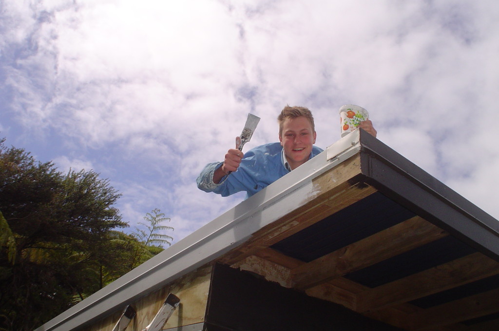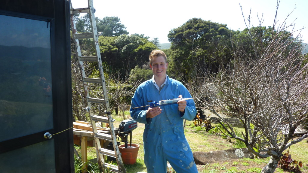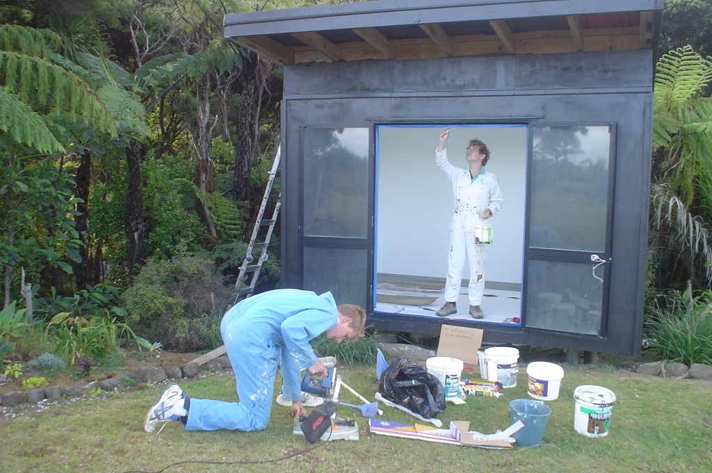 - Kreissäge und Pinsel, im Hintergrund Mit-Wwoofer Paul