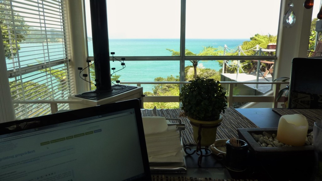 Mein „Arbeitsplatz“: Neue Blogupdates bei besten Sichtverhältnissen (Blick vom Esstisch). Weitere gute Sache: Am Morgen verlassen die Delfine die Bucht und am Abend kommen sie über-das-Wasser-springend vom Ozean zurück und übernachten direkt in der Bucht vor unserem Haus.