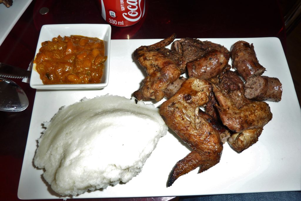 - Chakalaka – das Gericht der armen Bevölkerung. Hier allerdings mit Fleisch serviert. Dazu eine weiße, kalorienreiche Mais-Pampe. Gegessen wird traditionell mit Händen – großartig!