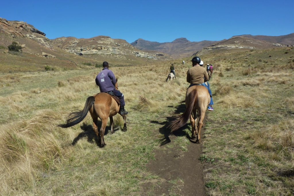 Nur etwa 18 Kilometer von Clarens entfernt befindet sich der Golden Gate Highlands National Park, der die Besucher mit gelb-rötlichen Sandsteinformationen und zahlreichen Tierarten beeindruckt. Etwas abseits der öffentlichen Hauptstraße kann man zwei Loops (Schleifen) fahren, die an (nach den letzten Regenfällen) grün-bewachsenen Landschaften mit Wildpferden sowie Antilopen- und Zebra-Herden vorbeiführen. Wir entschieden uns für eine einstündige Reittour – wer den Rücken eines Pferdes nicht genauer kennengelernt hat wird froh sein, wenn es sich beim ersten Ritt um „nur“ eine Stunde handelt – und eine zweistündige Quadtour durch die Berge und das an Clarens angrenzende Township Kgubetswana.