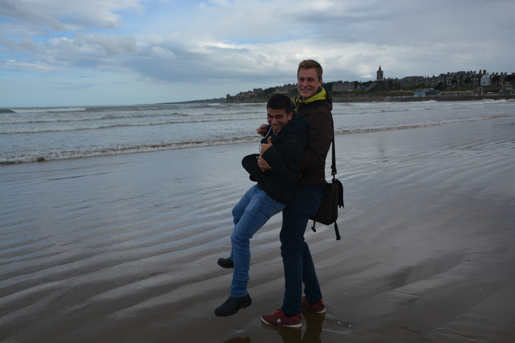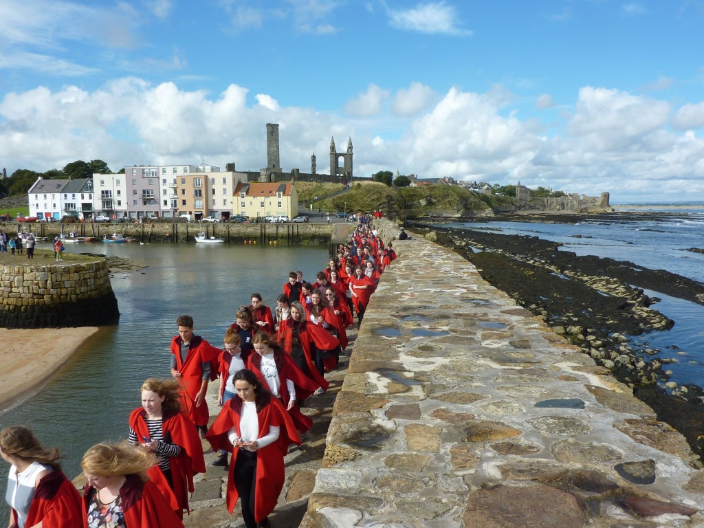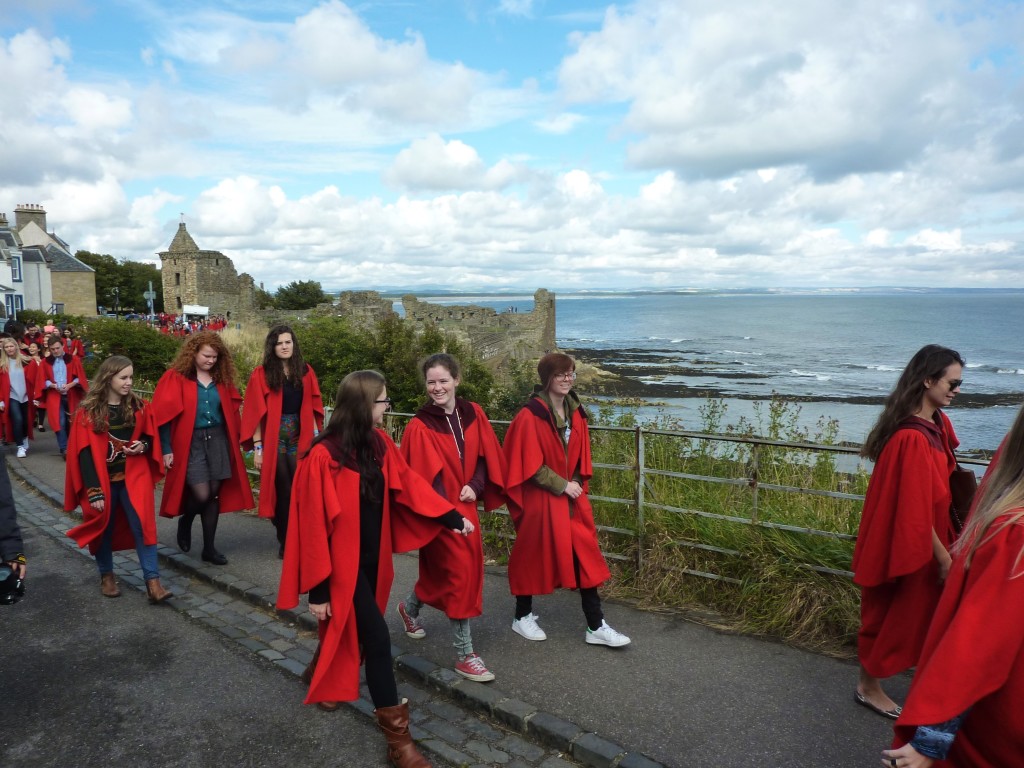 Natürlich nicht ganz. Bei insgesamt 5 Zauberschulen, äh Universitäten, steht immer etwas an. Hier konnten wir im richtigen Moment die neu-eingeschriebenen Studenten bei ihrer Matriculation-Zeremonie beobachen. Traditionell spaziert man am Strandufer entlang bis zum östlichsten Punkt der Stadt, begleitet von Dudelsack-Musik, einer „Zepter-ähnlichen-Skulptur“ und roten Zauberumhängen. Eine echte Harry Potter Kulisse!