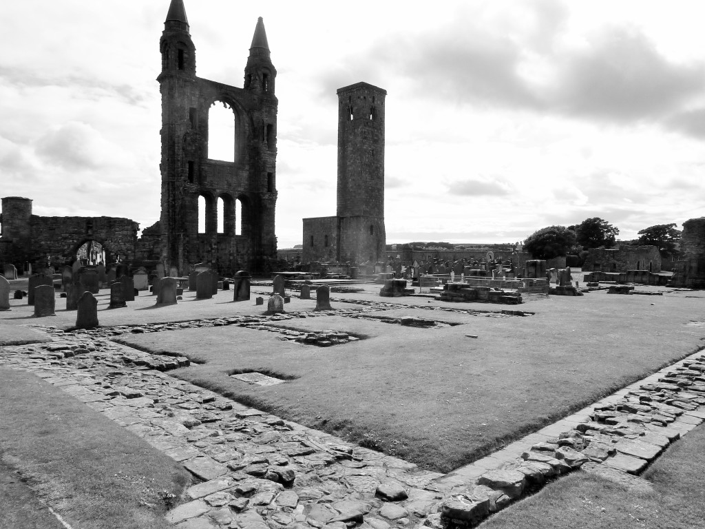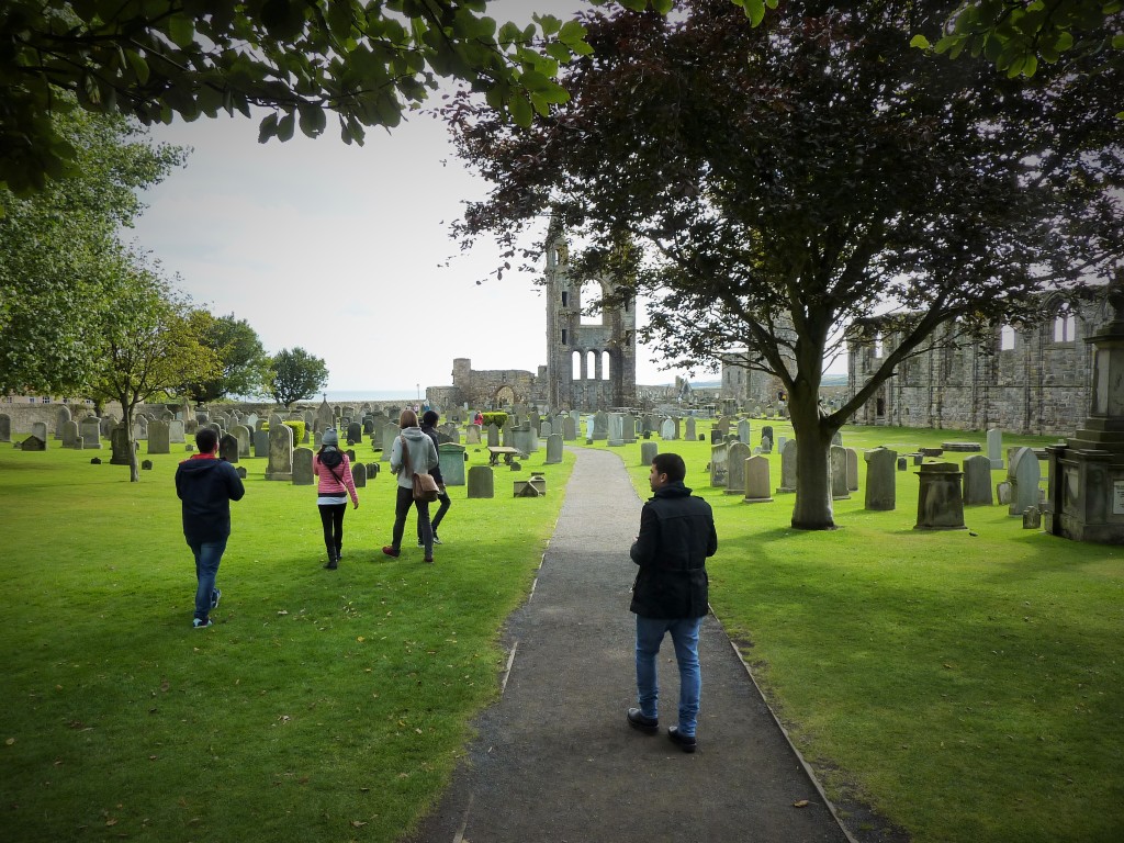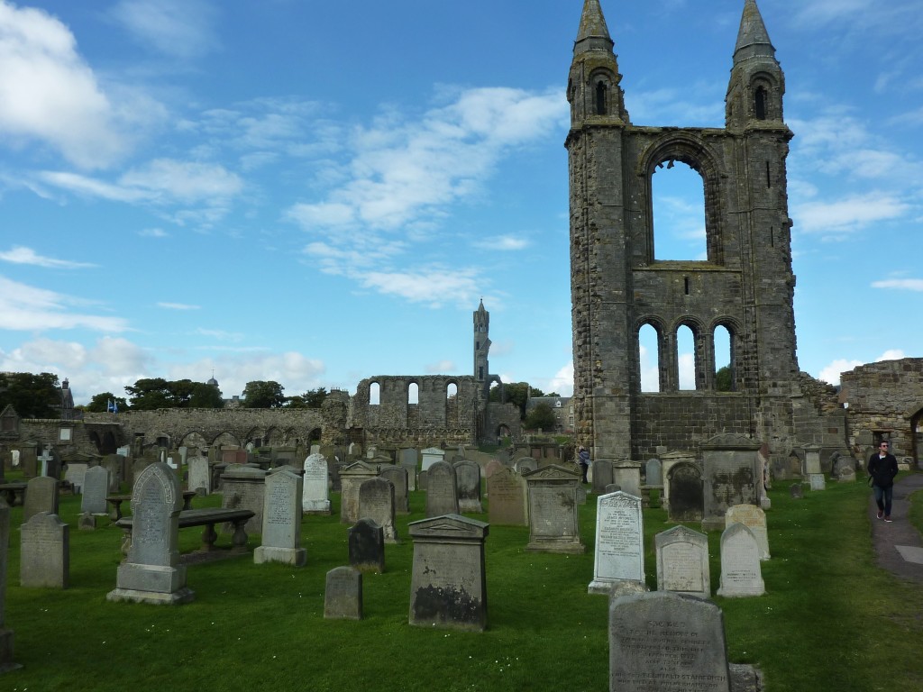 Viele jahrhundertealte Gebäude, zum teil originalgetreu restauriert, verhelfen der Stadt zu ihrem mittelalterlichen Flair. Folgt man der Fußgängerzone zum östlichen Ende der Stadt, stößt man auf die Überreste der St. Andrews Cathedral, die einmal die größte Kirche in ganz Schottland war. Interessant waren hier vor allem die zahlreichen Inschriften auf den Grabsteinen, die häufig in englischer- und teilweise auch in lateinischer Sprache [… ja, das große Latinum kriegt man schließlich nicht geschenkt] geschrieben waren. Einer meiner Favoriten: „He lived and died by suicide“.
