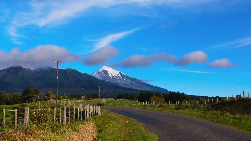 - Der Mount Egmont, oder Mount Taranaki, wie ihn die Maori nennen, von der Straße