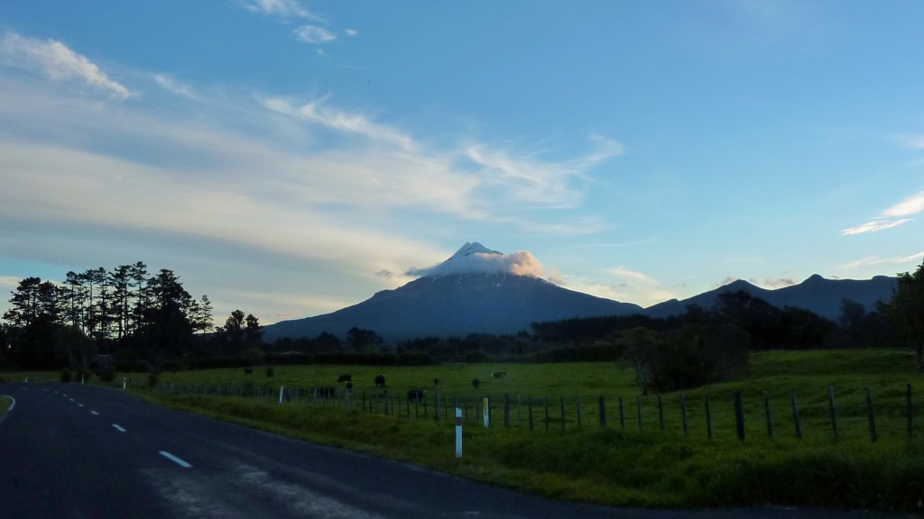Naja, ersteinmal zum Anfang. Das Objekt der Begierde „ist ein solitärer, 2518 m hoher Vulkan mit perfekter Spitzkegelform im Westen der Nordinsel in Neuseeland in der gleichnamigen Region. Er gilt geologisch als relativ junger Vulkan, der erst vor knapp 135.000 Jahren aktiv geworden sein soll. Die letzte Eruption wird auf das Jahr 1854 datiert und soll neben Lavaflüssen auch mit fünf größeren Eruptionen einhergegangen sein.“ (soweit zum Wesentlichen, Auszug Wikipedia, „Taranaki“).