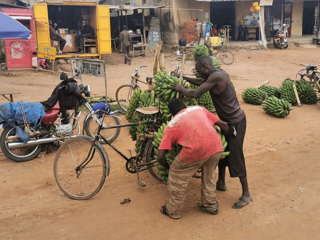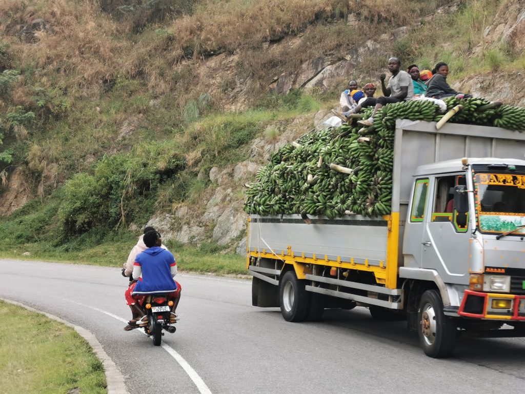 Ein großer Teil der geernteten Bananen wird für das Nationalgericht Matoke verwendet. Dazu werden die Kochbananen zunächst geschält, in Bananenblätter gewickelt, in einen Topf gegeben und für einige Stunden gedämpft. Nach dem Dämpfen wird Matoke zu Brei gestampft und direkt aus den Bananenblättern serviert. Matoke gibt es immer: morgens, mittags, abends, und zwischendurch. Für den geschmacksintensiven und von vielen Einflüssen geprägten europäischen Gaumen ist das gewöhnungsbedürftig, zumal das Gericht keinerlei Geschmack aufweist und ähnlich nährstoffarm wie der Nsima-Maisbrei in Malawi (in Uganda „Posho“ genannt) ist. Mir fällt kein vergleichbares Grundnahrungsmittel ein, das in Deutschland annähernd die Bedeutung des Matoke-Stampfs erlangen könnte … möglicherweise kommt der Bier-Status in Bayern dem am nächsten … Um die Bananenstauden vom Feld auf den Markt zu transportieren, gibt es kein Verkehrsmittel, das nicht genutzt wird. Auf ein Fahrrad passen je nach Lagerung und Risiko-Bereitschaft drei Bananenstauden – also bis zu 600 Bananen. Und auch bei LKWs werden die physikalischen Grenzen außer Kraft gesetzt.